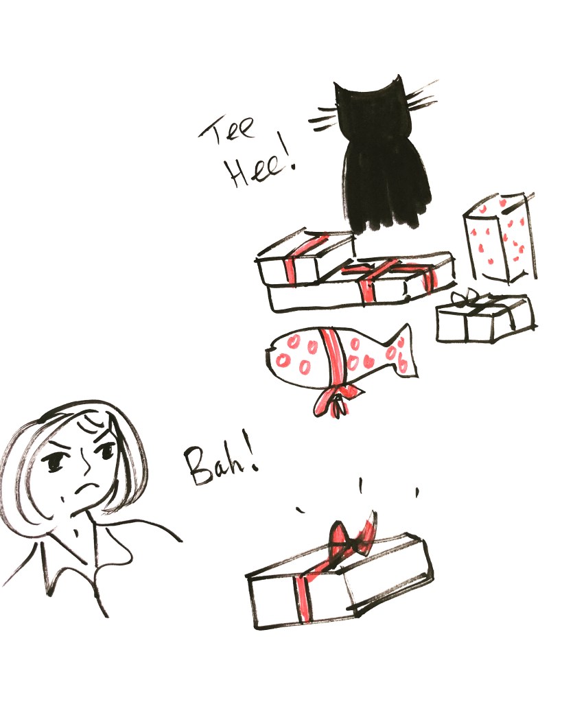 Dobby’s Advent XV Dobby sinks her teeth into day Fifteen And Fish gets very exasperated He yearns for Dobby to clean up her act Instead of the havoc she created! More Advent action tomorrow….. Like Loading...