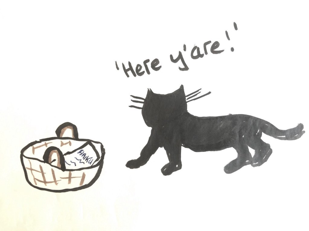 So, the Poetry Basket – one of the stunning and prolific poets reading last night – Donall Dempsey has some very relevant and clever Haiku to share with us… Dobby? Poetry Basket please…..